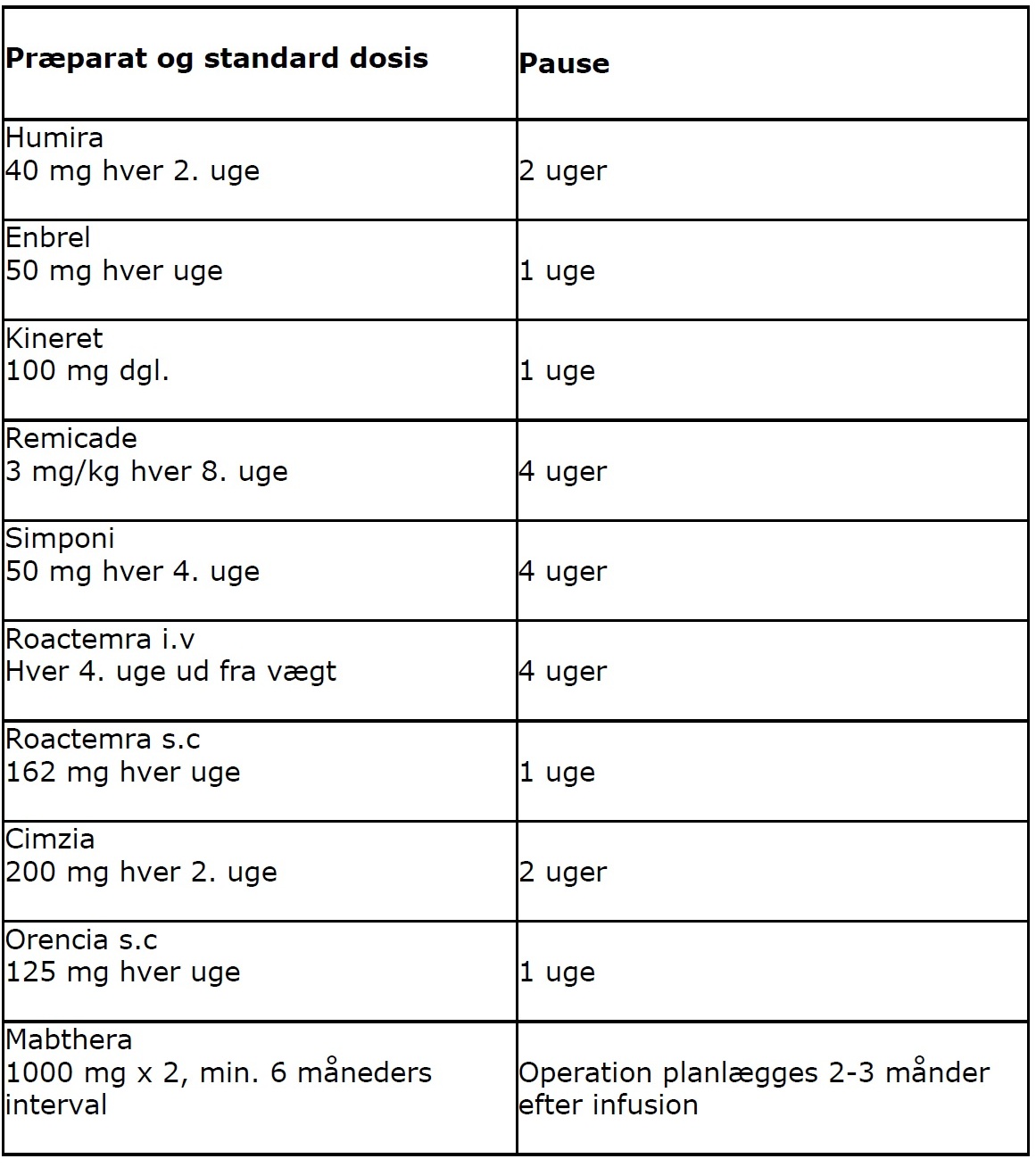 1. Før ortopædkirurgiske indgreb planlægges pause med biologisk medicin på følgende vis: