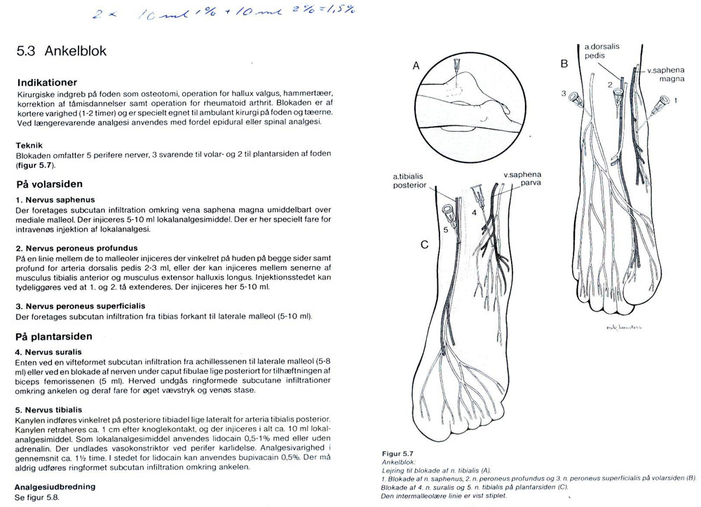 N. suralis kan alternativt opsøges subcutant (5 ml.) mellem laterale malleol og achillessenen.