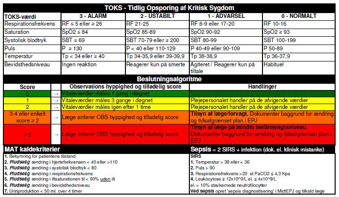 Patienter med TOKS 3 eller derover kan ikke flyttes ud af afdelingen uden at det er aftalt mellem vagthavende læger, og der skal foreligge en plan for håndtering af tilstanden i journalen