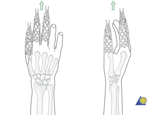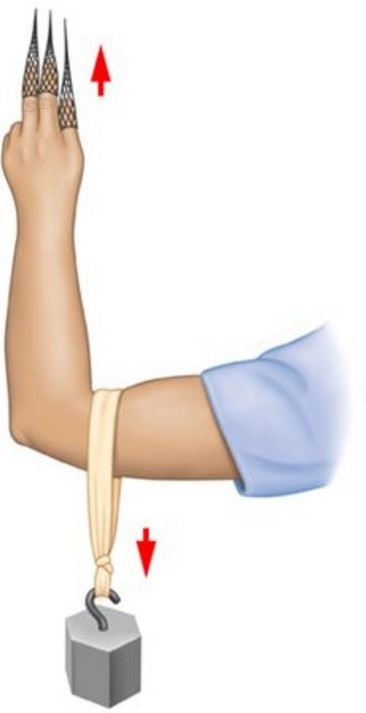 Brug evt Kineser finger stræk, hvor de 3-4 radiale fingre låses i finger traps og holdes i et dropstativ mensder hænges en vægt på overarmen. Se billede