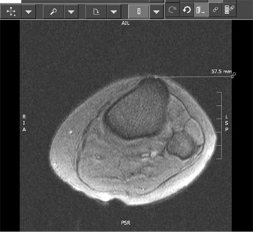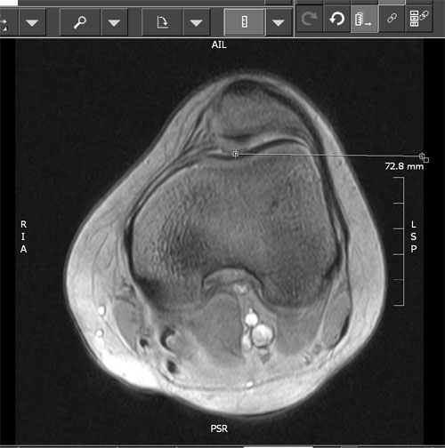 Brug MR sagitale snit, kør ned til tuberositas og mål afstand fra midten af