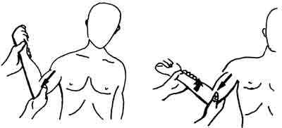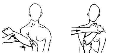 Der trækkes jævnt og kraftigt i armen, den roteres udad og albuen føres ind foran kroppen. Patientens hånd føres til raske skulder.