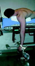 Pt. lejres på maven på et højt leje. Den afficerede arm hænger ud over kanten. Der hænges nu vægt på armen, enten ved hjælp af elastikbind eller evt. ved anvendelse af plasterstræk, 5-8 kg. Efter ca. 15 min. vil skulderen oftest være reponeret. (Det sker ikke altid med et føleligt