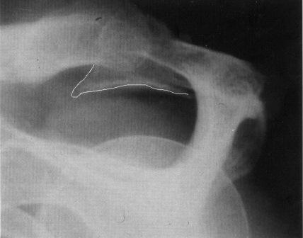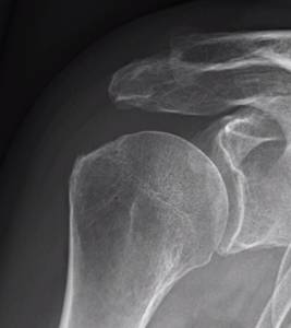 Radiologiske tegn til impingment (sklerosering og osteofytdannelse), både på acromion og tuberculum majusområdet.