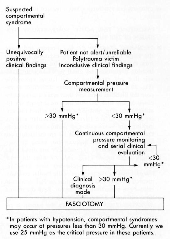 Fasciotomi tærskel: • Diastolisk blodtryk minus compartmenttrykket (delta P værdi) < 30-40 mm Hg |